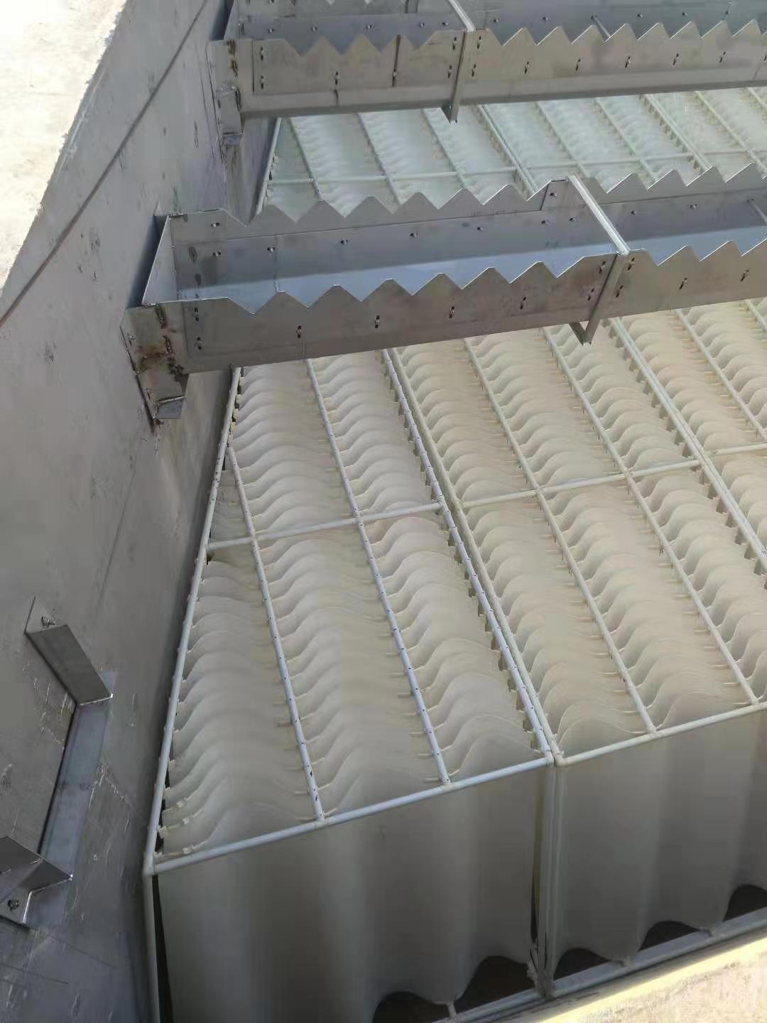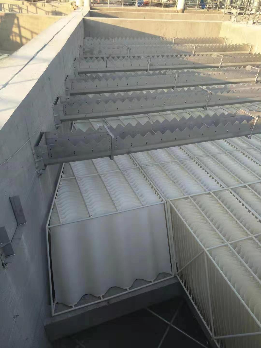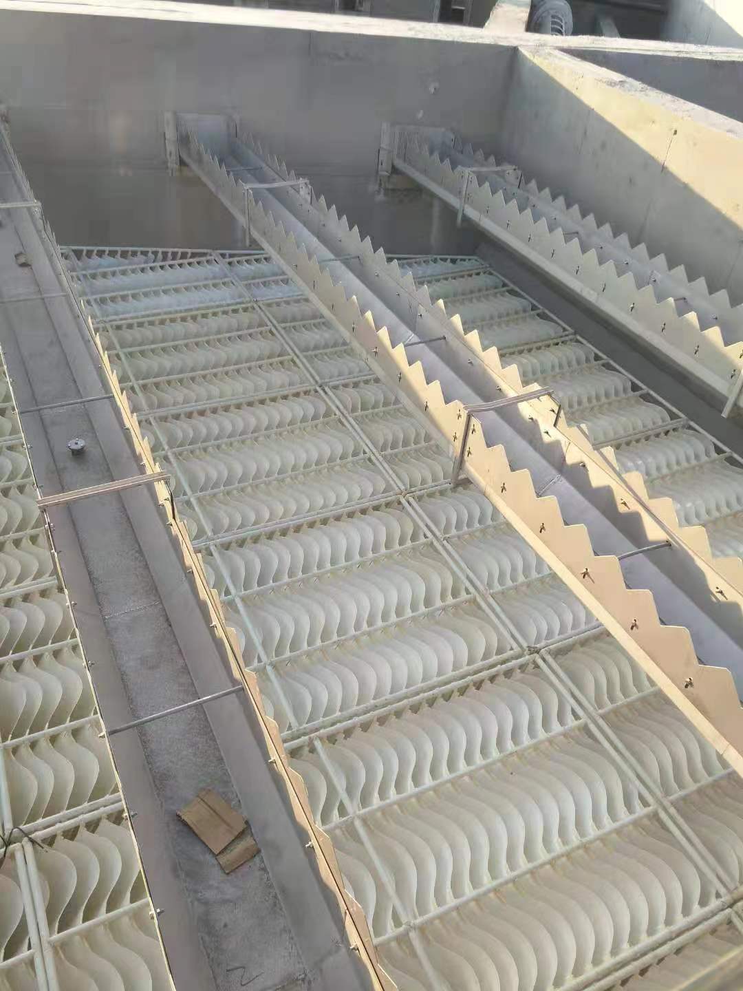 白龙港污水处理厂提标改造工程BLG - E4 标100万吨/日、BLG - E6 标除磷池系统25万吨/日。采用高效沉淀池混合、絮凝和沉淀工艺。澄清区斜板泥水分离为框架式波形斜板沉淀器。白龙港污水处理厂提标改造工程BLG - E4 标段高效沉淀池构筑物平面为直角梯形。为保证框架式波形斜板箱与池型完全吻合,没有短流区。BB体育公司研发了棱形直角梯形框式斜板箱。为国内创新。满足了白龙港污水处理厂三期提标改造工程直角梯形高效沉淀池的处理功能要求。